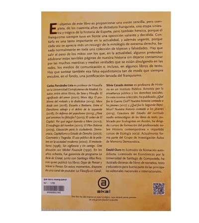 El objetivo de este libro es proporcionar una visión sencilla, pero completa, de los cuarenta años de dictadura franquista, una etapa siniestra y trágica de la historia de España, pero también heroica, porque el franquismo siempre tuvo en frente una oposición valiente y decidida. Contarla es una tarea importante en la actualidad, y además urgente, porque cada vez se aprecia más un resurgir de la mitología de extrema derecha, basada normalmente en toda una colección de tópicos y falsedades. Hay que salir al paso de los mitos con los que, en la actualidad, algunos pretenden edulcorar estas terribles páginas de nuestra historia sin dejarse contaminar por las muchas mentiras y medias verdades que se están divulgando en las redes,los medios de comunicación e,incluso,en algunos libros de texto.
